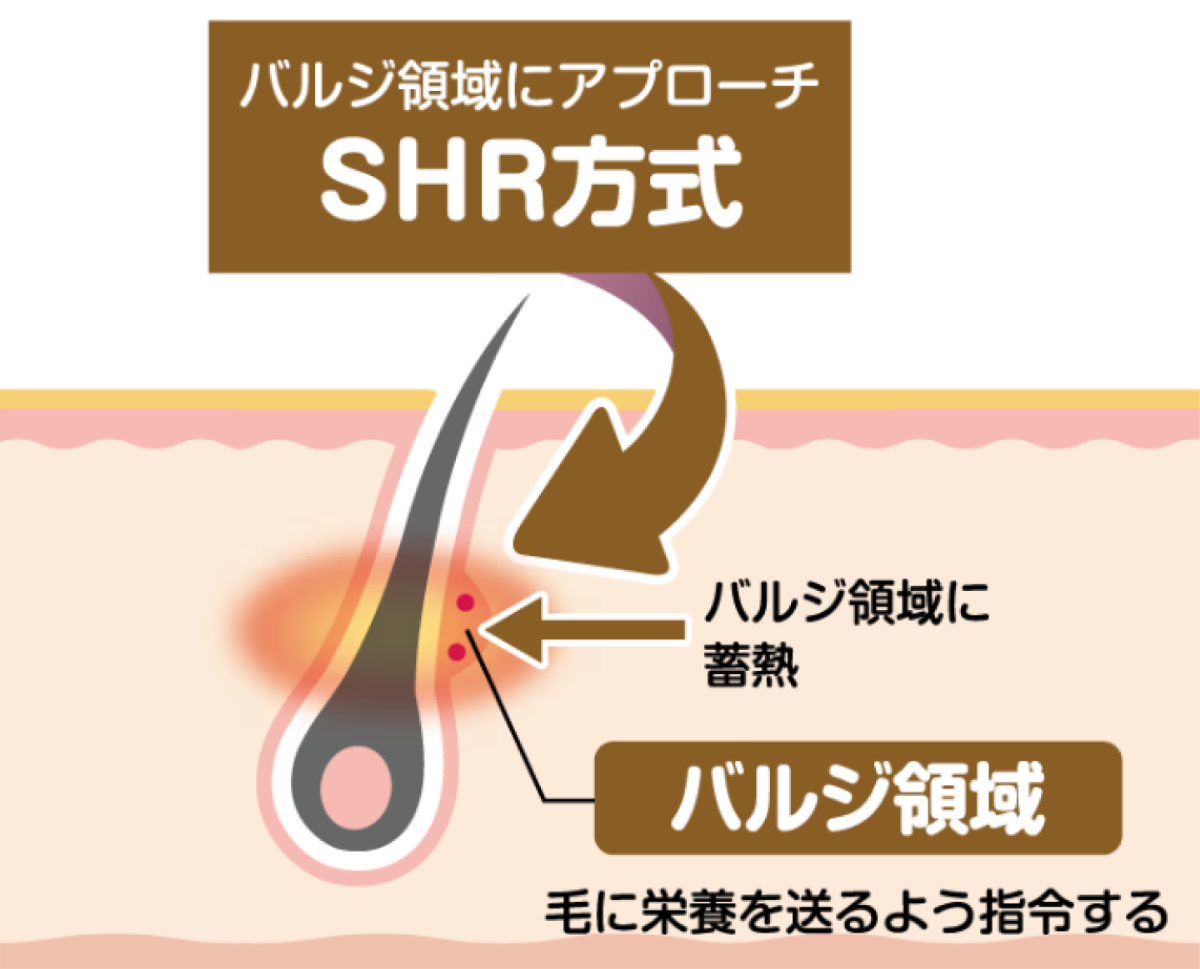SHR脱毛とは、 スーパー ヘアリムーバルの略で、 バルジ領域に熱を繰り返し蓄熱することで、 抑毛していきます。優しい光で施術するので、 痛みを感じにくく、毛周期に関係なく、2週間ごとに施術可能です。