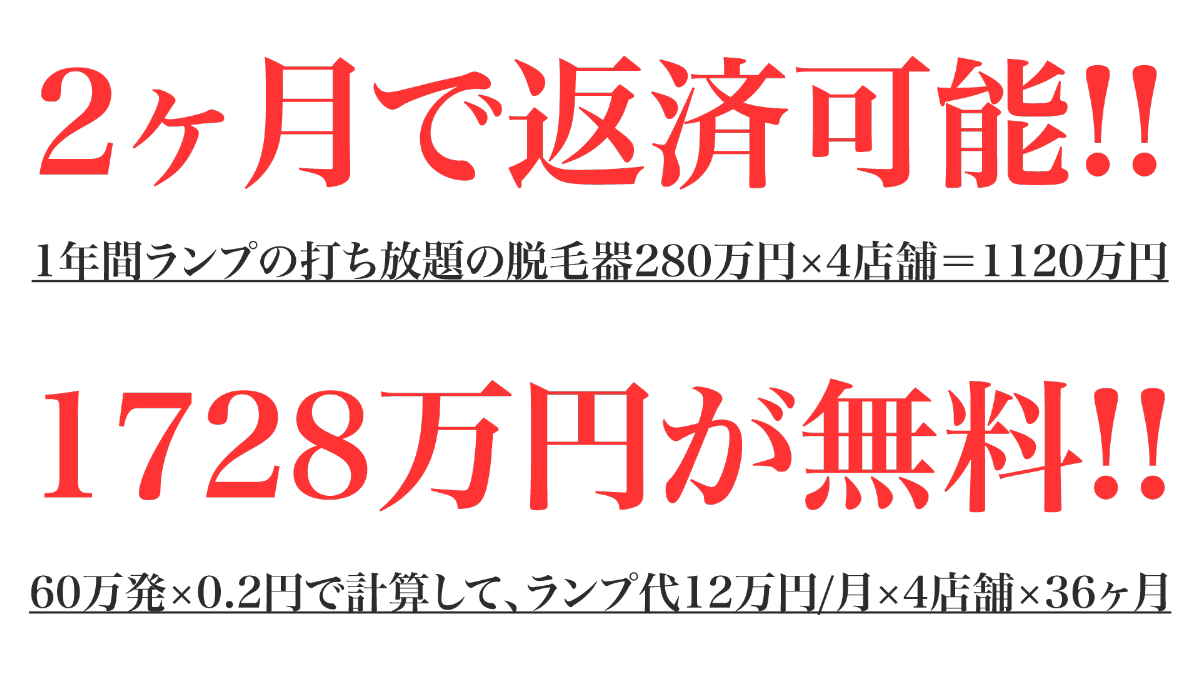 既存のお客様に、1年間ランプの打ち放題の脱毛器を入れて、 新規のご提案をして、ホットペッパーを掲載して、広告宣伝をした場合、 1店舗1000人の既存の会員さんが居た場合、 300人以上が都度払い脱毛をした場合