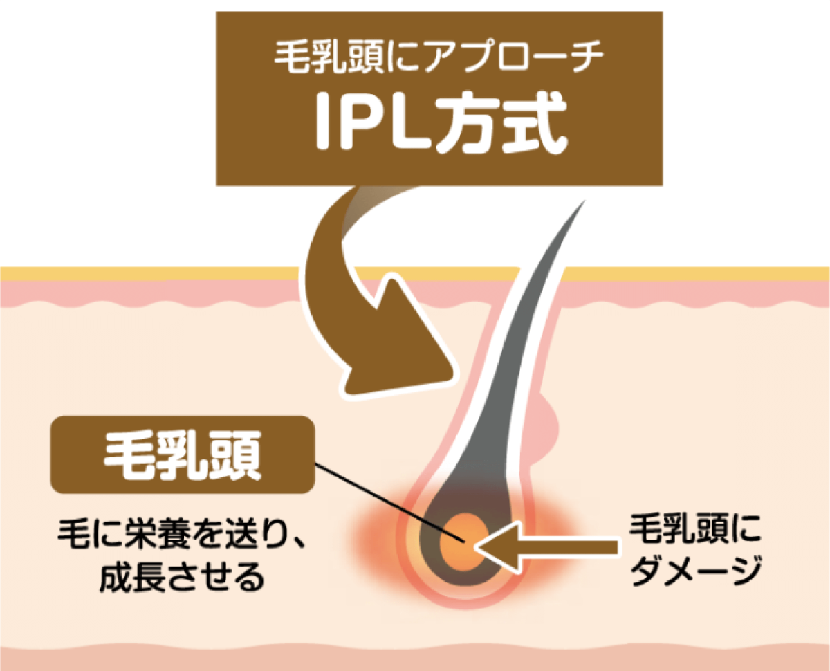 IPL脱毛とは、インテンスパルスライトの略で、 メラニン色素へ光を吸収させ、毛乳頭まで熱を届け、毛乳頭にダメージを与えることで、脱毛を促していく方式です。 毛周期に合わせて施術を繰り返すことで、脱毛の効果が得られます。