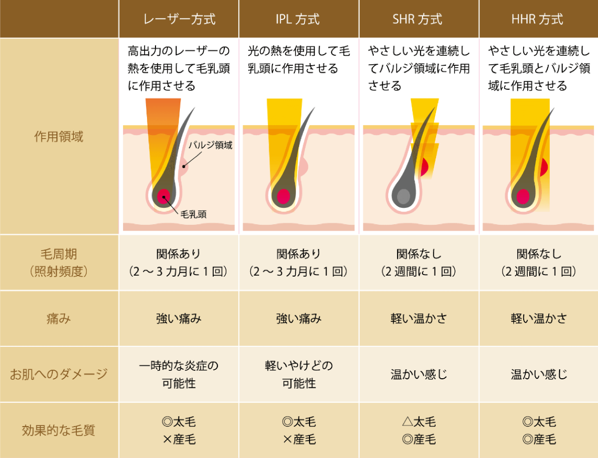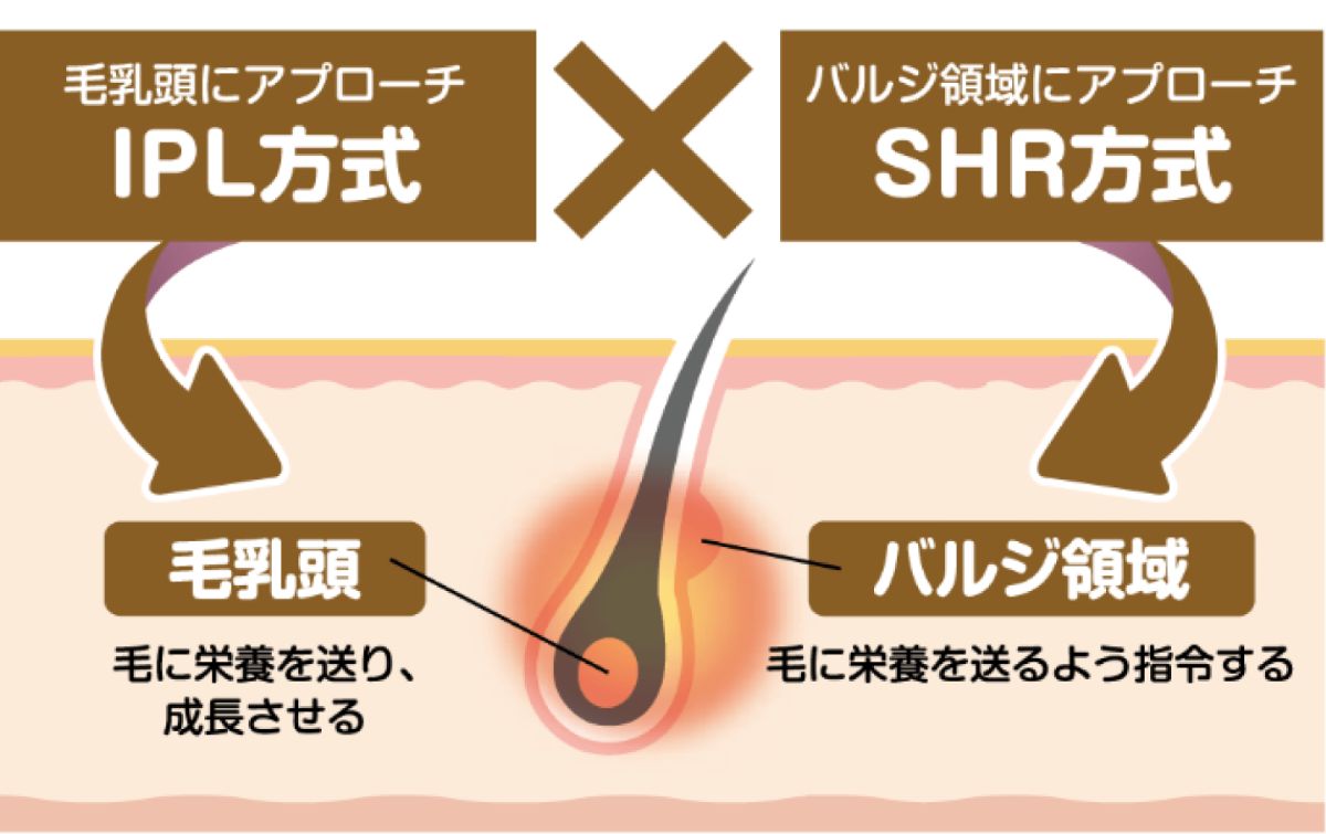 HHR脱毛とは、 ハイブリッドヘアリムーバルの略で、光エネルギーを毛のメラニンを介して毛乳頭に直接影響を与え、除毛・減毛させる従来の「IPL方式」と、 バルジ領域に熱を加え 発毛そのものを衰退させる「SHR方式」の優れているところを組み合わせたハイブリット方式のことです。