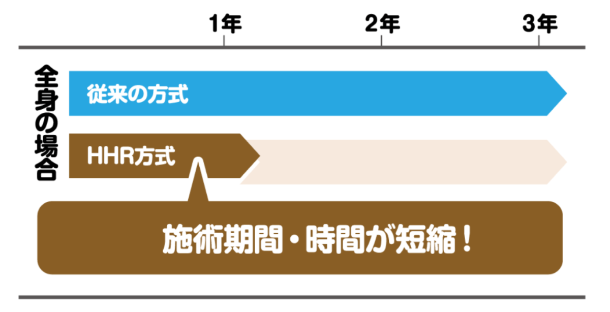 従来の方式は毛周期に合わせる必要があり、2~3カ月開けて施術を行う必要がありました。そのため施術期間が3~5年かかってしまうこともめずらしくありませんでした。「HHR方式」は、毛周期に関係なく2週間毎に施術可能なため、従来の脱毛に比べ、短い期間で効果を実感していただけます。
