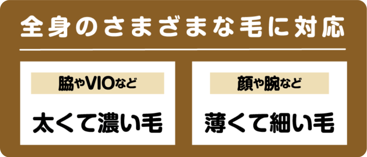 従来の方式は黒い毛にしか反応しなかったため、 産毛は難しいと言われていました。『HHR方式』は毛乳頭とバルジ領域に働きかけるため、それらにもムダ毛ケアの効果が持てるようになりました。もちろん、黒い毛にもしっかり反応するため、 脇やデリケートゾーン(VIO)などの太くて濃い毛にも施術が行えます。