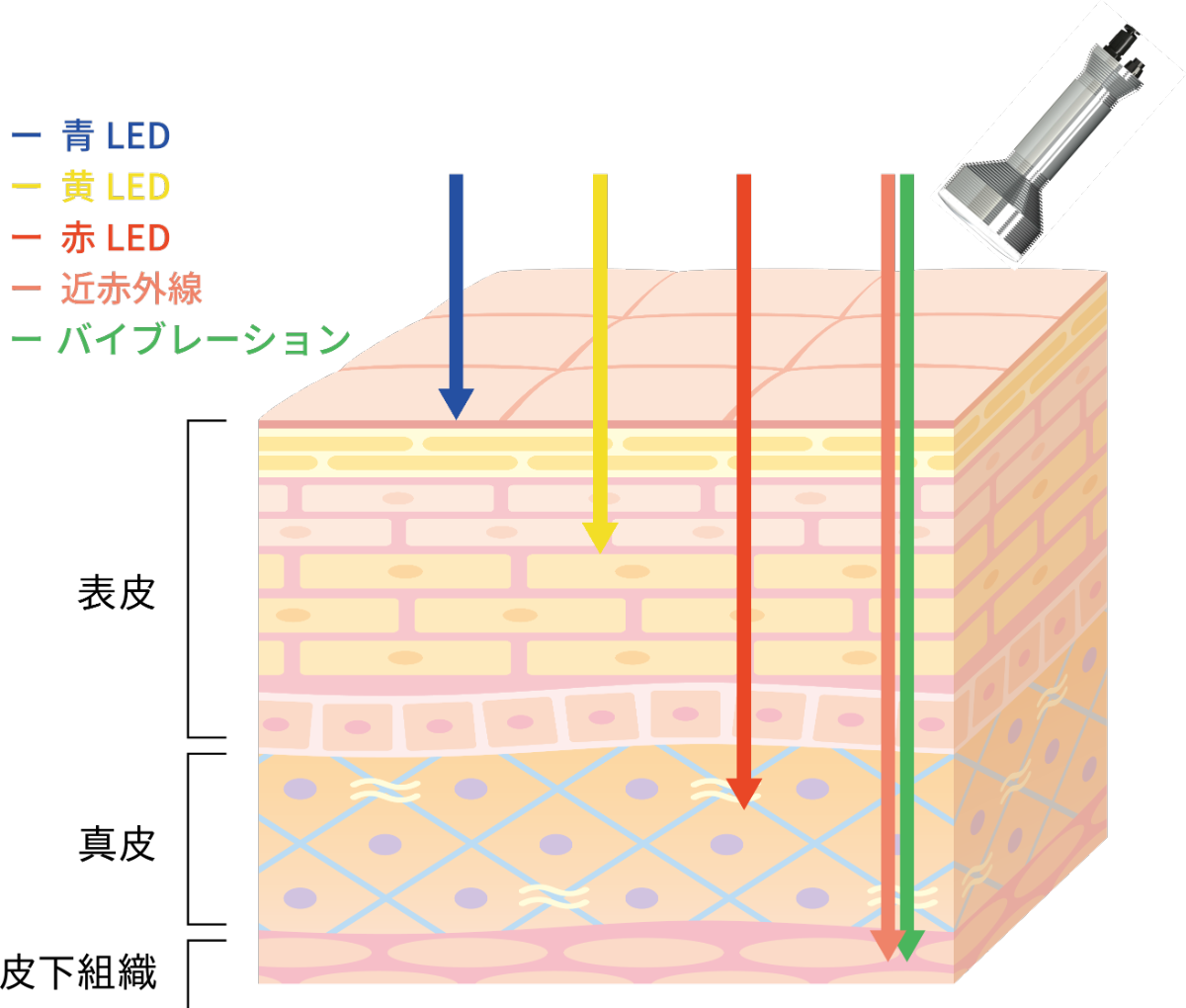 皮膚の表面から厚い角質層を近赤外線が通過し、 真皮の細胞に働かけます。