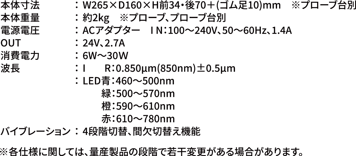 この近赤外線機器「Esthe Japan PROMAX」は血流を促進する効果があり、 この効果を活かして、シワやたるみの改善痩身の相乗効果が期待できる 近赤外線の美容機器として開発されました。 近赤外線の照射に加え、4色のLEDの切り替えと4段階のレベルの バイブレーション機能を搭載した業界初の複合近赤外線機器です。 LED色の切り替えをすることで、LED単色のメニューや近赤外線を 組み合わせてのメニュー構築が可能で千差万別のお客様のニーズに対応しての 御提案が出来ます。 サロン様での施術効果を最大限に引き出すことができるブースター機器として ご使用いただけます。また、施術効果も即効性と持続性の両面をカバーし、 よりお客様の満足度を上げることが出来ます。